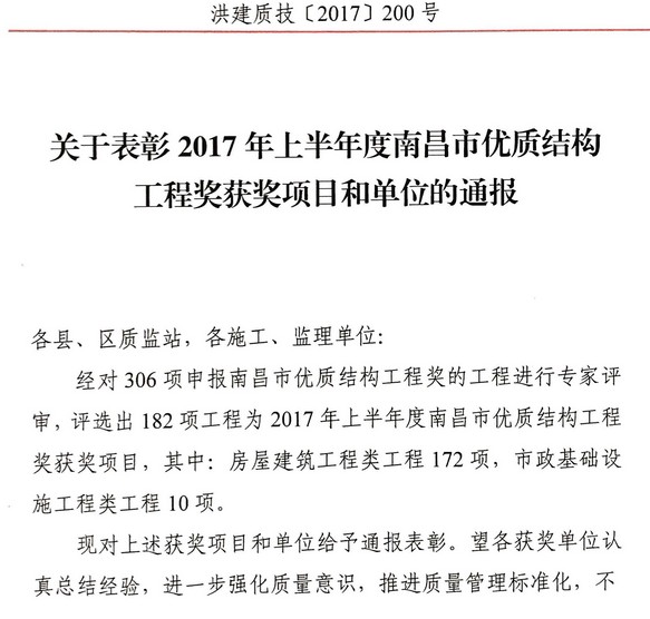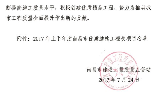 本报讯 由我公司承建的南昌市瑶湖郊野森林公园游客服务中心项目,在2017年度荣获结构优良工程奖项。此次获得的荣誉离不开中宁全体人员的共同努力,中宁在未来的发展中,也将秉承着“专业、优质”,不断前行!